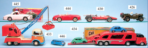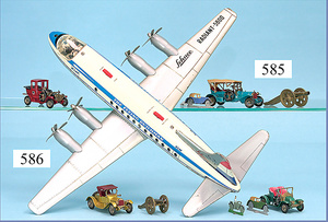 Autotransporter, Car Transport, Made in Japan, Blech, Friktionsantrieb, 37 cm, beladen mit 3 Käfermodellen, kl. Heckscheibe, Friktionsantrieb, 13 cm, leicht bespielt, guter - sehr guter Zust., Orig.-Kart. mit bunt lithogr. Deckbild