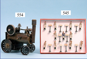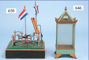 MÄRKLIN, kl. Zentralbahnhof, ca. 1919, Grundplatte 29 cm x 18 cm, Mitteldurchgang, Bronzefenster, reine Verglasung liegt zerbrochen bei, 1 Verglasung mittelteilig gebrochen, nicht sichtbar, mit kl. altersbed. Lackfehler, sehr schöne Farben, schöne Orig.-Zust.