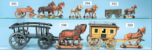 Leiterwagen mit 2 untersch. Zugpferden, Leiterwagen aufwendig gearbeitet, Zugpferde Fell bezogen, Fell abgerieben, Glasaugen, Guss-Speichenräder, 62 cm