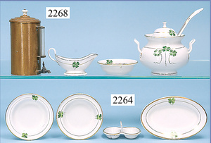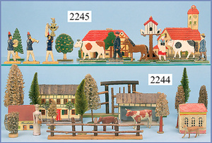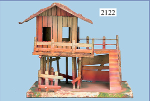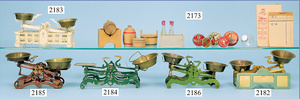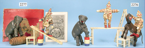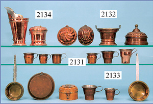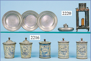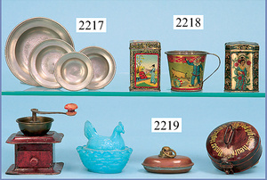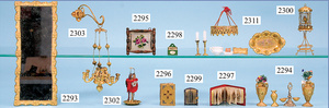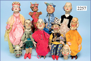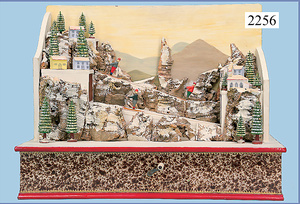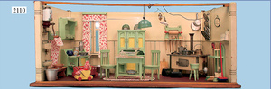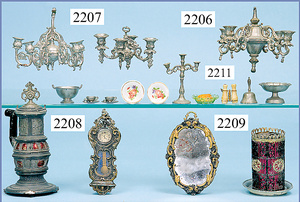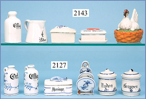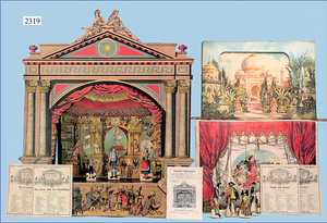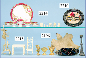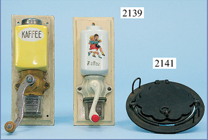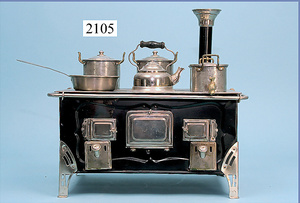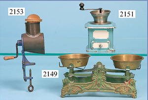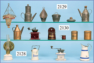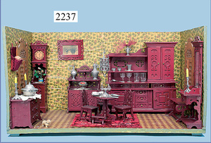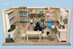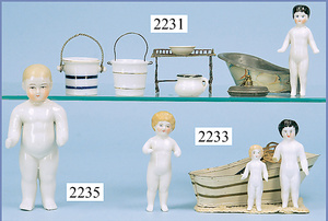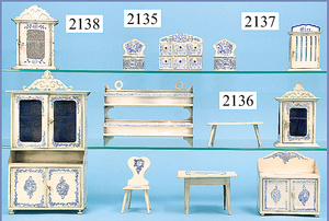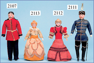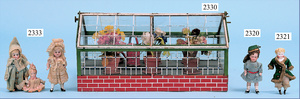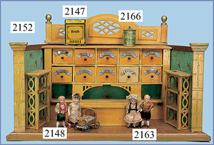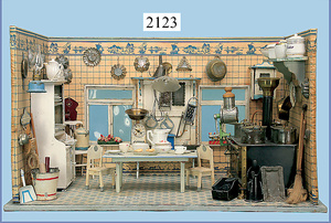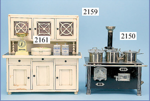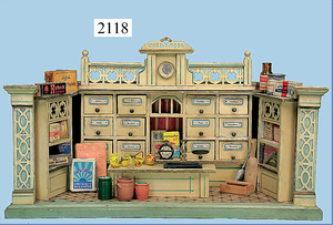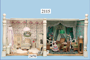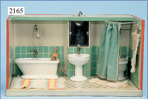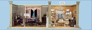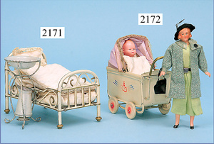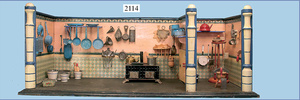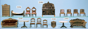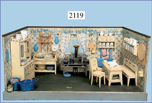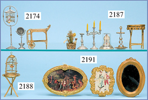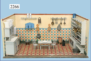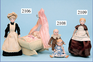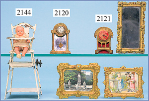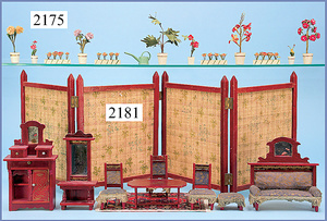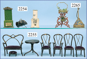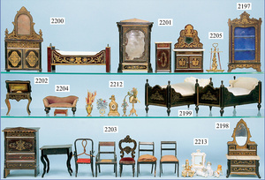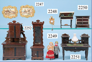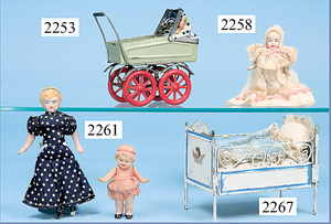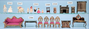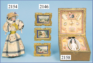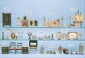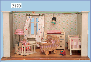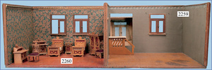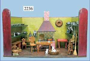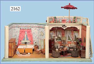 kl. dekor. Puppenstuben-Haus, 53 cm hoch, 32 cm breit, 23,5 cm tief, in Burgform, schmale Form, Front ganz zu Öffnen, mit großen rundem imitierten Holztor, imposante Backsteineinrahmung, darüber Inschrift, 3 angedeutete kl. Fenster, Schornstein, hübsch gemalte Sonnenuhr, mit langem Ziegel u. römischen Ziffern, seitlich weitere Backsteinimitationen, rechts Vorbau, links kl. angedeutete Bank, innen 2 Zimmer, mit off. vorgebautem Kamin, liebevoll eingerichtet mit teilw. hochwertigem Zubehör, Wohnzimmer, 1 Kommode mit BOULLE Kippspiegel-Aufsatz, mit Schublade, Sofa, Zinnteile, Tisch, Vogelkäfig, Kinderwiege, mit kl. Biskuitpuppe, kl. Biedermeierbett, Deckenleuchter, Glasperlenarbeit, Puppenstuben-Puppe, Biskuitbrustblattkopf, außergew. Frisur, Biskuitarme u. -beine, 1 Hand bestoßen, Stoffkörper, dekor. Arbeit, wohl um 1900, sehr schöne Gr.