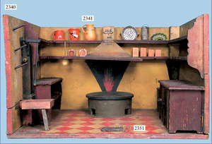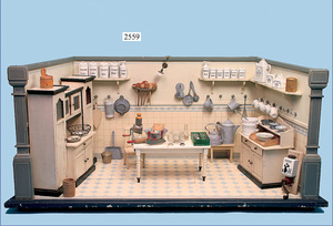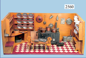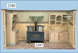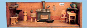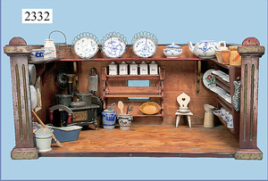 Puppenküche, 70 cm breit, 32 cm hoch, Tapeten entfernt, gebeizt u. lackiert, obere Leiste später, mit Herd, reichh. Zubehör, Porzellan blau-weiß, Keramik-, Holz- u. Blech-Teile, Gewürzdosen, Essig u. Öl, Backformen, schöne Größe