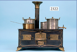 Puppenküchenherd, 36,5 cm breit, 30,5 cm hoch, Messingtüren, Löwentatzenfüße, Topfsatz, Weißblech mit Messingdeckeln, Wasserschiff mit Messinghahn, wohl BING, mit Brenner