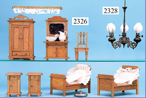 Puppenstuben-Schlafzimmer-Möbelprogramm, 2 Betten 15,5 cm, 2 Nachttische, Kleiderschrank, 19 cm, Kommode, Stuhl, Zinn-Bettflasche, Kleinteile, einige Teile Bettzeug u. Wäsche, sowie eigenst angefertigte Gardinenstange