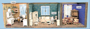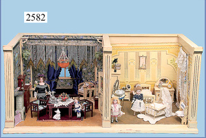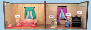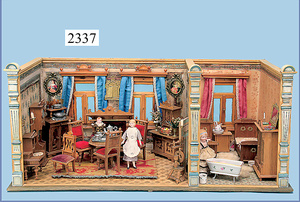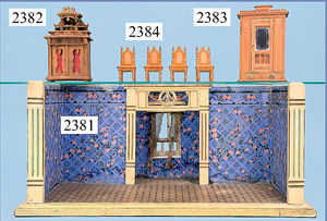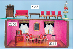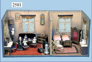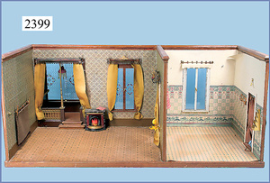 GOTTSCHALK, 2-teilige Stube, 80 cm breit, 36 cm hoch, 37 cm tief, 3 Fenster, alte Tapete an Wand u. Boden, verzierte Frontleisten, Durchgangstür, möbliert, Gründerzeit-Möbel, reichhaltig Zubehör, Zinnteile, einige Stubenpuppen, dekor. Teil