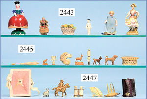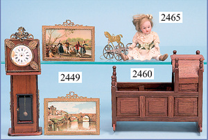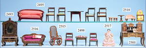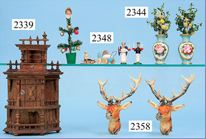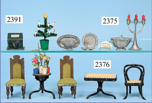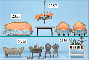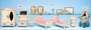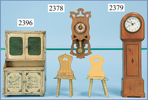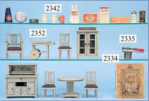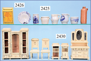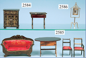 Puppenstuben-Möbelprogramm, ca. 1925, Schrank Höhe 14 cm, Vitrine 13 cm, Sitzgruppe, Tisch, 3 Stühle, Armsessel, 1 Servierwagen