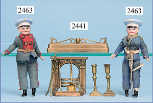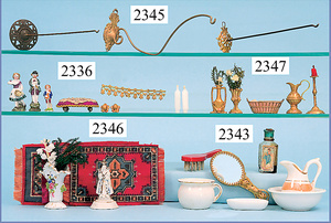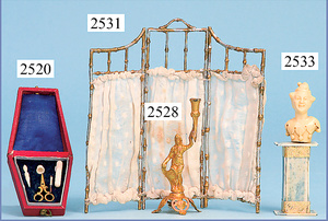 Konv. Puppenstuben-Zubehör, Bürsten, Kämme, Fußschemel, 3 Biskuitfiguren, Messingteile (n. a. T. f.)