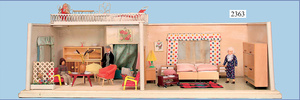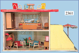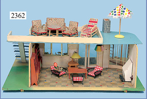 Puppenstuben-Haus, ca. 1955, 71 cm breit, 32 cm hoch, 48 cm tief, gr. Fenster, Eingangstür, Treppe zum Dachgarten, Teicheinsatz fehlt, möbliert, mit schönen Möbelprogrammteilen aus der Zeit