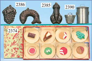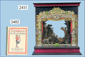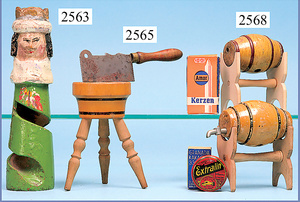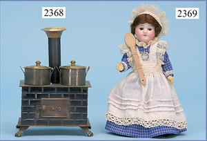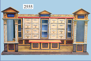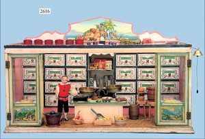 CHRISTIAN HACKER, Kolonialwarenladen, am Boden signiert, 69 cm, 38,5 cm hoch, 28 cm tief, ca. 1890, vorne 2 Schaufenster zum Aufklappen, Schubladen Papier beklebt, mit lithogr. u. verzierten Papierschildern, lithogr. Bilder aus dem Kolonialleben, mit Theke, reichhaltig Zubehör, Holzteile. Schachteln, Blechdosen, Gerichte, mit Puppenstuben-Puppe, Verkäufer, Biskuitbrustblattkopf, -arme u. -beine, Stoffkörper, insges. schöner Orig.-Zust.
