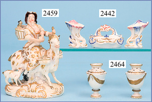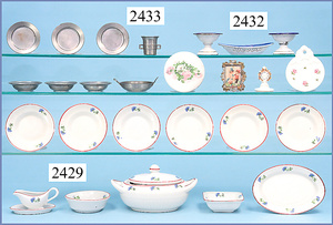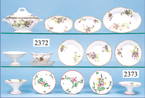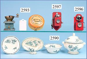 Puppenstuben-Speiseservice, 11 Teller, Durchm. 8,5 cm, Suppenschüssel, Sauciere, Henkel restauriert, Salz u. Pfeffer, nicht dazu passend, 1 Schale