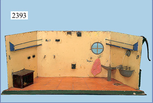 kl. Biedermeierpuppenstube, 57 cm breit, 24 cm hoch, 34 cm tief, 2 Fenster, sehr schöne Bodenbemalung, Orig.-Außenbemalung, mit altersbedingten Lackfehlern, Tapeten neuer, Vorhänge neuer, alter Spiegel, Messingblech vergoldet, schöne Gr.