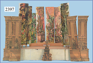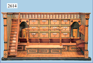ERZGEBIRGE, Kaufladen, mit Treppe u. Geländer, 63 cm breit, 35 cm hoch, 33 cm tief, Schubladen mit Porzellanschildern, aufgeklebte Holz marmorierte, lithogr. Papierverzierungen, Orig.-Theke, Fass mit Hahn, Petroleum u. Essig, alte Tapete, Orig.-Bemalung, dekor., schöne Gr., ca. 1890