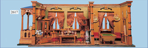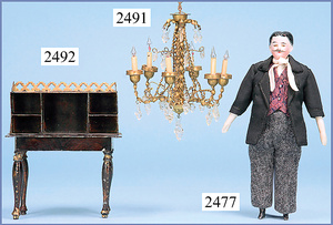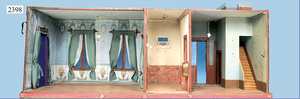 CHRISTIAN HACKER, 2-teilige Puppenstube, mit überbauter Terrasse, 3 Fenster, Mitteldurchgang, 2-flügige Ausgangstür, alte Tapete an Wand u. Boden, insges. 86 cm breit, 36 cm hoch, 34 cm tief, möbliert, kl. Empore mit Geländer, reichhaltig Zubehör, Bilder Messingblech vergoldet, Zinnteile, mit Billardzimmer