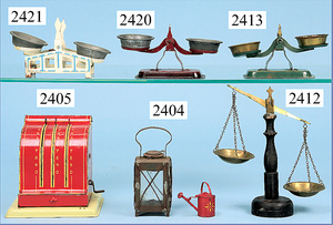 Konv. Teile für Puppenstube o. Kaufladen, Bierkrug mit Deckel, Zuckerhut, Blech lithogr., 7 cm, Krüge, 2 Kisten, Kassenblock