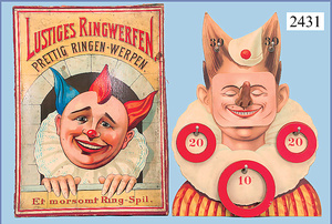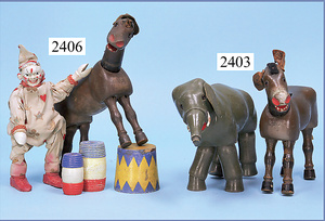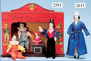 kl. Zirkustheater, Monstrositäten, Kuriositäten, 34 cm breit, 29 cm hoch, Zauberer, 2 Clownfiguren, sowie einige Teile Zubehör, ca. 1920, ausgef. Zauberer mit glasiertem Brustblattkopf, anmodelliertem Hut, Stoffkörper, Clownfiguren, Holz/Drahtkörper, Porzellanköpfe