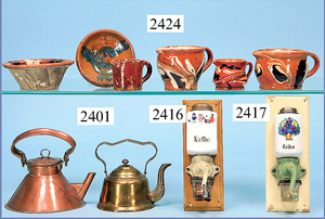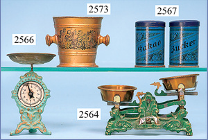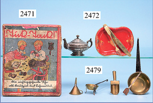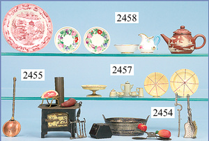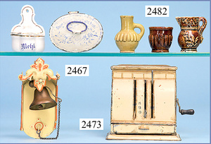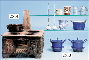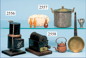 Konv. frühes Puppenküchen-Zubehör, 3 Keramikkrüge, Keramikbackformen, 7 Teile, 2 Teile Weißblech, 1 Kehle Messing, für frühe Küche