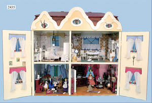 2-teilige Puppenstube, mit Erker, 80 cm breit, 37 cm hoch, mit alter Tapete, später 1x tapeziert, außen farblich überarbeitet, möbliert, reichhaltig Zubehör, mit Puppenstuben-Puppen, 2 Stubenpuppen neuer