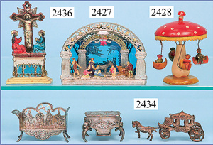 kl. Puppenstuben-Weihnachtsbaum, 13 cm, dazu 2 Teile ERZGEBIRGE, Engel u. Bergmann, ERZGEBIRGE Kinderwagen, kl. Schlittenfahrer, 1 Bein fehlt