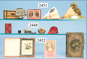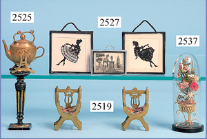2 Teile Puppenstuben, Messingblech vergoldet, Papageienständer, mit kl. Wachspapagei, 2,5 cm, 1 Halter, mit 6 Skatkarten lithogr., 3 cm