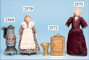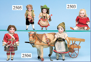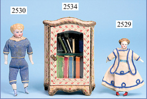3 Teile Ganzbiskuit-Puppenstuben-Puppen, 6 cm - 9,5 cm, feste Köpfe, bewegl. Arme u. Beine, 2 Puppen fest eingesetzte Glasaugen