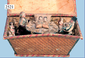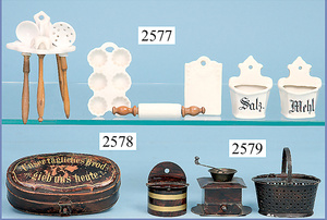 ROCK & GRANER, 3 Teile, kl. Kaffeemühle, 4 cm hoch, kl. Metze, 1 Korb durchbrochen, mit Deckel, wohl für Lebend-Federvieh, 6 cm, ausgef.