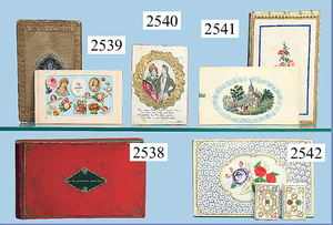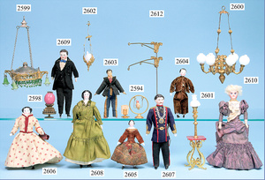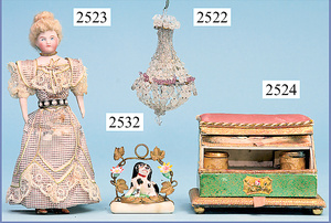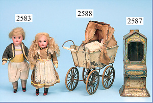 kl. 2-teilige Puppenstube, Biedermeier, 62 cm breit, 28,5 cm hoch, 30 cm tief, alte Tapete, doppelflügige Durchgangstür, Fenster, 1 Fensterglas fehlt, möbliert, Wohnzimmer, Sitzgruppe, Schreibtisch mit Marmorplatte, einige Teile Messingblech vergoldet, einige Zinnteile, Schlafzimmer, Schrank, Betten, kl. Zinnwiege, Stange zum Himmel 1x geklebt, 3 Puppenstuben-Puppen, schöne Gr.