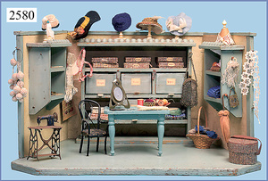 kl. Modeladen, 44 cm, wohl Bastelarbeit aus altem Gehäuse, mit Zubehör, Stoffballen, Nähkissen, Schere, Spiegel, Puppenschmuck, Kleinteile