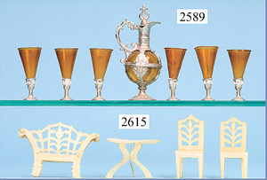 filigrane Zinn-Sitzgruppe, Tisch-Durchm. 9 cm, Zinn Glas montiert, Bank, 2 Stühle, Zubehör 2 Kerzenleuchter, sowie Serviceteile