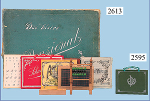 Lehrerspiel, Das kleine Pensionat, Rechenhefte, Noten, Mappen, Atlas, Zeichenvorlagen, Schulmappe, Rechenmaschine, Tafel, ABC-Tafel u. Züchtigungsstock, Orig.-Kart., verschlissen, um 1900, 1 Schulbank