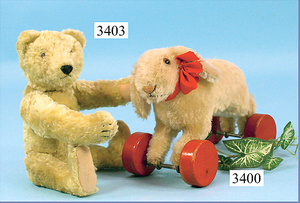 STEIFF, Hase auf 4 Rädern, 20 cm, ohne Knopf, Schild u. Fahne, ein wenig bespielt