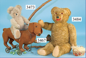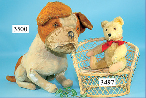 STEIFF, Hund, 1908 - 1918, mit Knopf, Reste der roten Fahne, ein wenig Mohairverlust, 20 cm, sonst guter Zust.