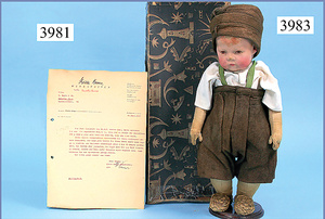KÄTHE KRUSE, Puppe Nr. I, 42 cm, Stoffkopf, 3 Hinterkopfnähte, sehr frühe Bemalung, ausdrucksstarke Augen, Herzmund, Körper Wachstuch, breite Hüfte, Arme etwas spätere Stoffvariante, jedoch mit separat abgenähtem Daumen, Arme wohl orig., bitte besichtigen, ein wenig Farbverlust auf der Stirn u. der Nasenspitze, sonst sehr schöner Orig.-Zust., frühe Variante kurz nach der Froschhand, spätere Variante der Arme kein Wachstuch