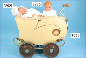 KÄTHE KRUSE, Puppenwagen, Art Deco, 69 cm, Griffstange verchromt, Chrom teilw. etwas angelaufen, Orig.-Bemalung, mit einigen altersbed. Lackfehlern, sowie Krakeleebildung, Metallteile teilw. etwas angerostet, ohne Verdeck, unberührter Orig.-Zust., vorne mit KK-Schriftzug, absolut selten