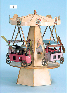 wohl BING, Karussell, Blech, 30 cm hoch, 4 Flugapparaten mit jeweils 3 Figuren, Blech lithogr., mit Musikspielwerk, intakt, kl. altersbedingte Lackfehler, insges. schöner Orig.-Zust., ausgef.