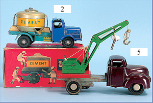 Zementwagen, frühe DDR-Produktion, Führerhaus Bakelit, produktionsbedingt starke Lackfehler am Führerhaus, Blech, Aufschrift: Zement, 21 cm, Schwungradantrieb, Orig.-Kart. verschlissen