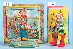 NBN, Angler mit gefangenem Fisch, Blech lithogr., Uhrwerk intakt, neuw., Orig.-Kart., Made in US-Zone