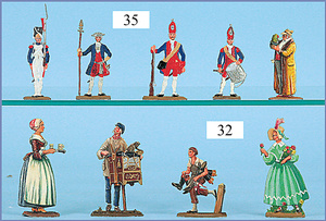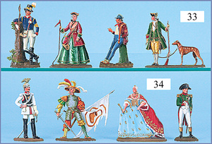 Konv. 4 flache Zinnfiguren, 8,5 cm, Leierkastenmann, mit Affen, Magd mit Tablett, Schuhmacher mit Schuhen, Dame mit Federhut u. Blumen, schöne Bemalung, Vorkrieg