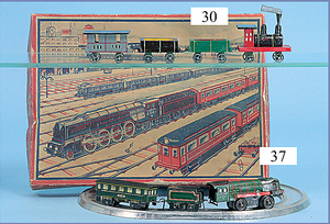 PENNY TOY, Zug, Blech lithogr. Vorkrieg, Schlepptenderlok, mit 1 Personenwagen, insges. 21 cm, mit Gleisoval, Uhrwerk intakt, sehr guter Zust., A. SCHUHMANN, Nürnberg, Orig.-Kart.