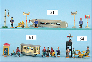 ERZGEBIRGE, Konv. Miniaturen, 3 Motorradfahrer, davon einer mit Seitenwagen, Straßenbahn, Fernsprechhäuschen, 3 Figuren, davon eine mit Nase