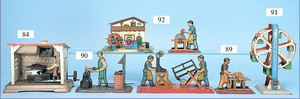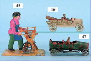 2 Teile Dampfmaschinen-Antriebsmodell, Blech lithogr., 2 Figuren, Mann an Säge, sowie Mann an der Stanze, 1 Figur, Mann am Schleifstein, beide bespielt