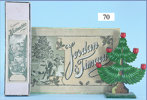 2 Orig.-Schachteln mit Weihnachtsszene, lithogr. Deckbilder, 1 Weihnachtsbaum, Holz, als Kerzenleuchter, ca. 1940