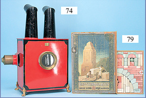 BING, Laterna Magica. Blech handlackiert, im Orig.-Kart., mit Brenner u. Schornstein, Linse gebrochen, dazu 1 gr. Anzahl von Glasbildern, im Orig.-Kart., bunt lithogr. Deckbild