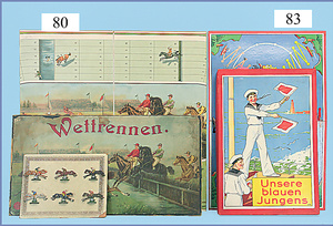 Pferderennspiel, Wettrennen, um 1900, 4-teiliges Brettspiel, Deckbild des Orig.-Kart. vorhanden, Unterseite vorhanden, Seitenteile seitlich fehlen, ohne Anleitung, 6 Zinnreiter