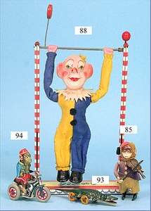 ARNOLD, Jimmy, Clown am Reck, Blech lithogr., Kopf Papiermaché, 38 cm, bespielt, untere Haltelaschen an einem Träger unschön befestigt