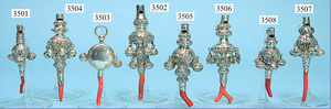 Silberrassel, mit Pfeife, 3 Kugeln (1 Kugel fehlt), etwas eingedrückt, gepunzt, geschwungener Korallengriff, Länge 3,5 cm