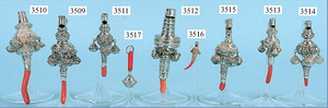 Silberrassel, filigran gearbeitet, mit Pfeife, 8 Glöckchen, Korallengriff, gemarkt "GU", Länge 11,5 cm