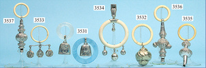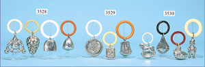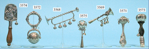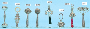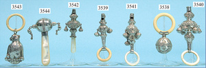 Konv.. Baby-Silberrasseln, mit Kunststoffring, filigran gearbeitet, gemarkt, Motiv: 1x Rosendekor, 1x Elfe, 1x Märchen Sterntaler, Länge 8, 10 u. 11 cm
