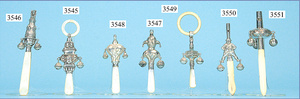 Konv. Babyrasseln, mit Horn- u. Beinring, Motiv: 2x Glocke, 1x Clown, 1x Rebe, Länge 9 u. 10 cm, gemarkt