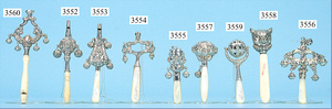 Kinderrassel, filigran gearbeitet, mit Pfeife, 4 Glöckchen, gemarkt "CAN", 19. Jhd., Griff Perlmutt, Länge 14 cm