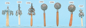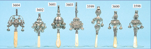 Silberrassel, filigran gearbeitet, mit Pfeife, 10 Glöckchen, gemarkt "S.A.S", Griff Bein, 19.Jhd., Länge 15 cm