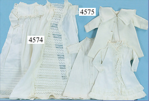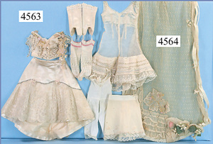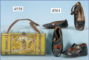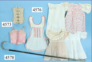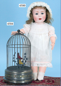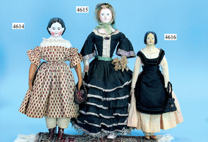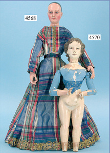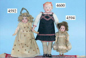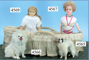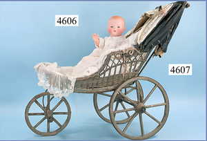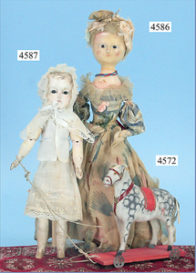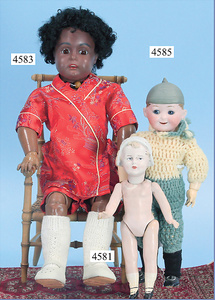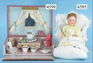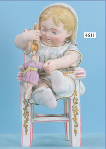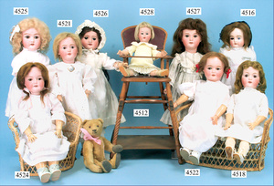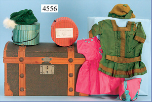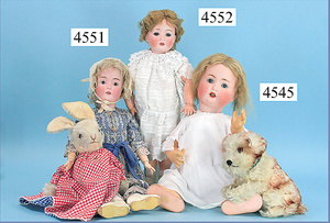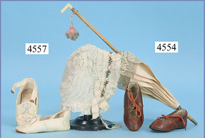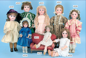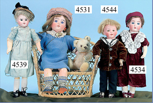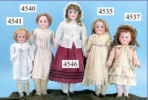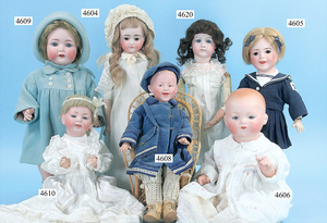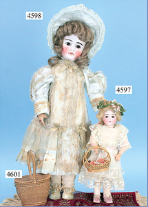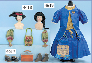 BAEHR & PROESCHILD, 309.10, Biskuitporzellan-Brustblattkopf-Puppe, 55 cm, blaue Schlafaugen, off. Mund, oben Zähne, früher Lederkörper, mit breiter Hüfte, Biskuitarme, 1 Arm ausgebessert, 1 Finger bestoßen, Oberarme Stoff, wohl nicht zum Körper passend, Kleidung alt o. aus alten Stoffen genäht, alte Mohairperücke